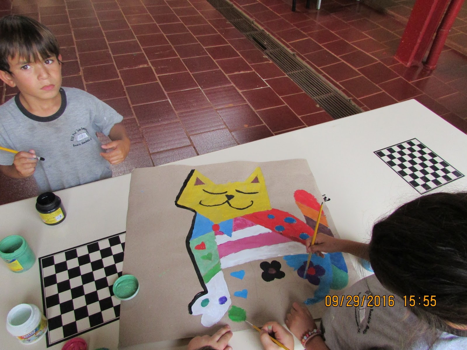 Trabalho realizado pelos alunos do 4º ano na disciplina de artes, montagem da bandeira do Brasil representando nela as suas cores. O verde representando a imensa floresta brasileira, amarelo as suas riquezas (moradia, educação, transporte...), azul representando as águas e o branco a Paz.